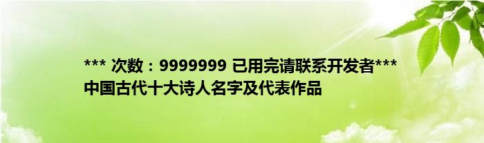 本文*** 次数:9999999 已用完请联系开发者*** 中国古代十大诗人名字及代表作品到此分享完毕,希望对大家有所帮助。