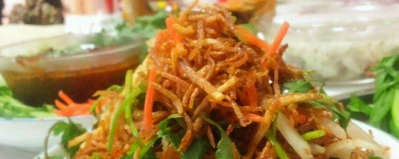 4、圆葱切丝、香菜切段,拌入炸好的土豆丝中。倒入白糖、盐、白醋拌匀即可食用。