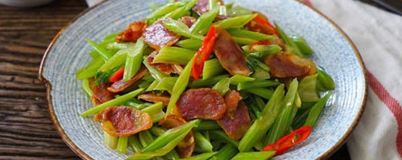 粤式腊肠3条(250克)、西芹400g。腊肠斜刀切薄片,芹菜切斜片。热锅,下入腊肠中火煎出油,出油后,倒入腊肠煸炒至芹菜至熟。最后加入适量盐调味即可。