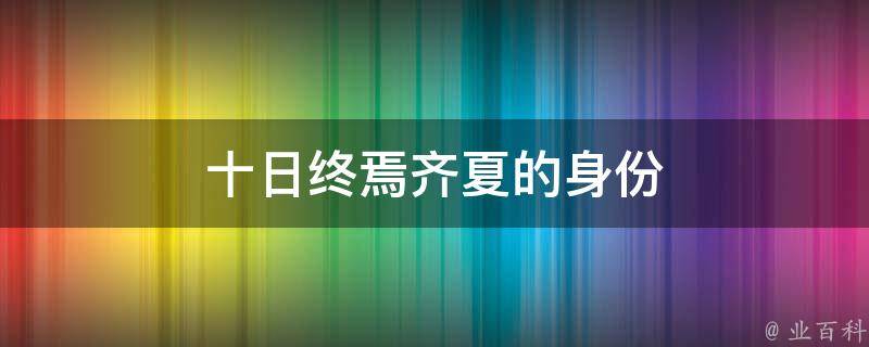 最佳答案十日终焉齐夏的身份是一行人中的智囊,他的智商和胆量在团队中屈指可数,因此大家都愿意跟着他一起行动。《十日终焉》是一本悬疑解密类型的死亡游戏求生文,主角齐夏意外被拉入了一个十日为期的死亡世界,只有集齐指定的道具才能逃离这里。