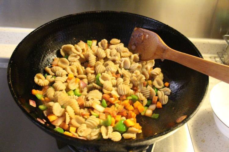 8、放入猫耳朵翻炒均匀即可出锅。