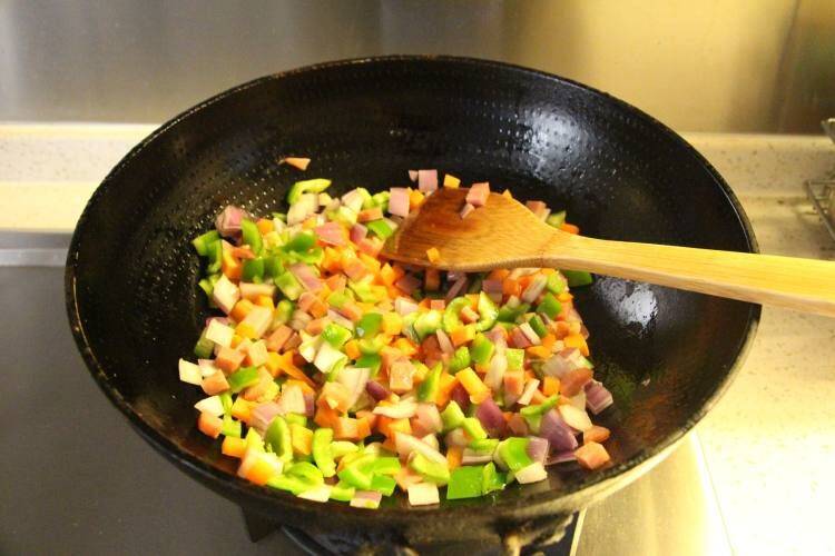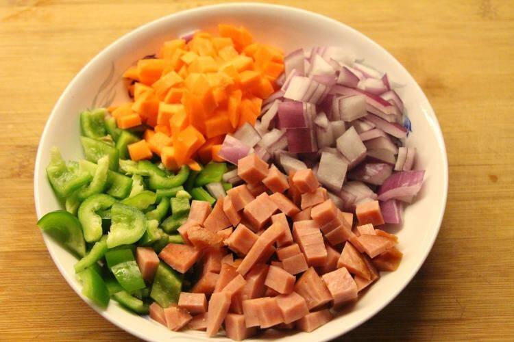 6、洋葱、胡萝卜、青椒、火腿分别切成丁。
