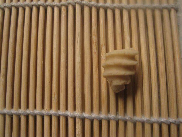 3、取一小块面剂子,在寿司帘上轻轻推成猫耳朵。