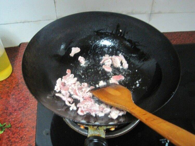 3、锅中热油爆香蒜米后把瘦肉放入翻炒。