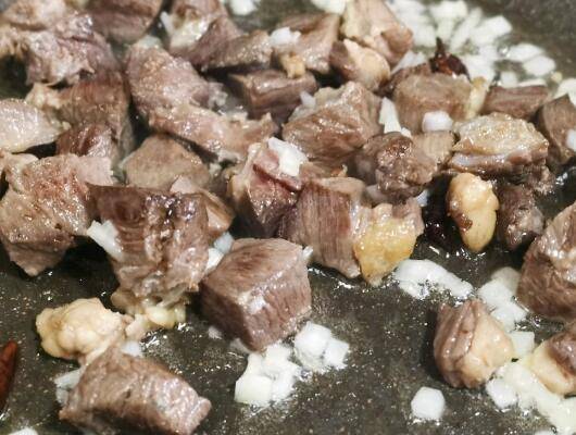 放洋葱煸香,倒入焯过水的牛腩,翻炒至微焦。