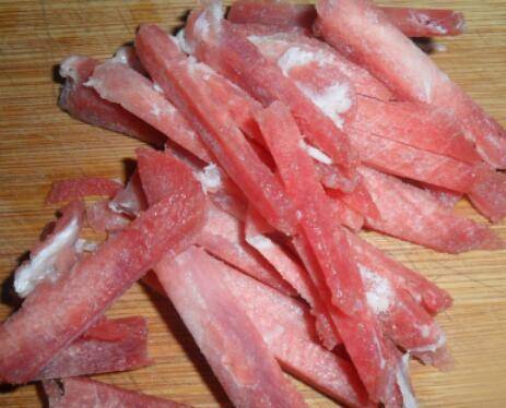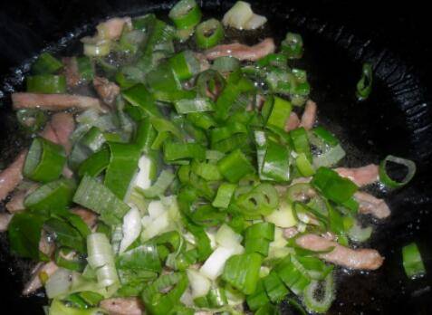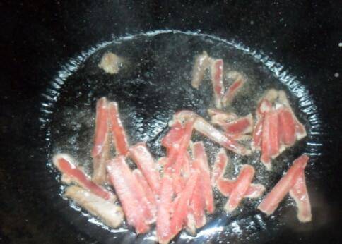 5.热锅,倒入花生油加热,放肉丝煸炒。