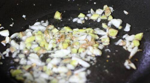 锅里倒入适量油,加入蒜末和姜末小火翻炒。