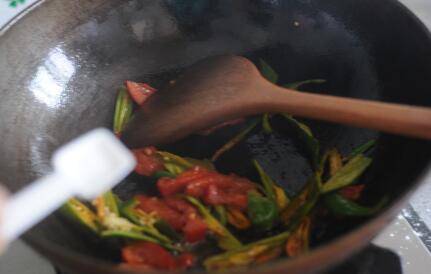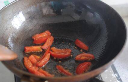 油锅烧热。将西红柿条放入锅里,中火炒软、汁水溢出。