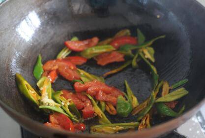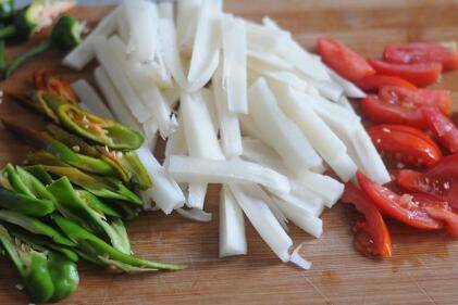 辣椒切片,西红柿切条。