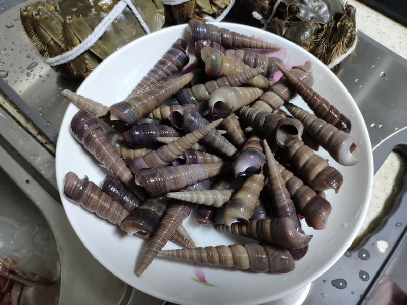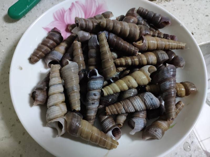 用料:锥螺500克、紫苏叶20片、姜适量、酱油1克、盐适量、红辣椒1个、植物油适量、蒜1瓣。