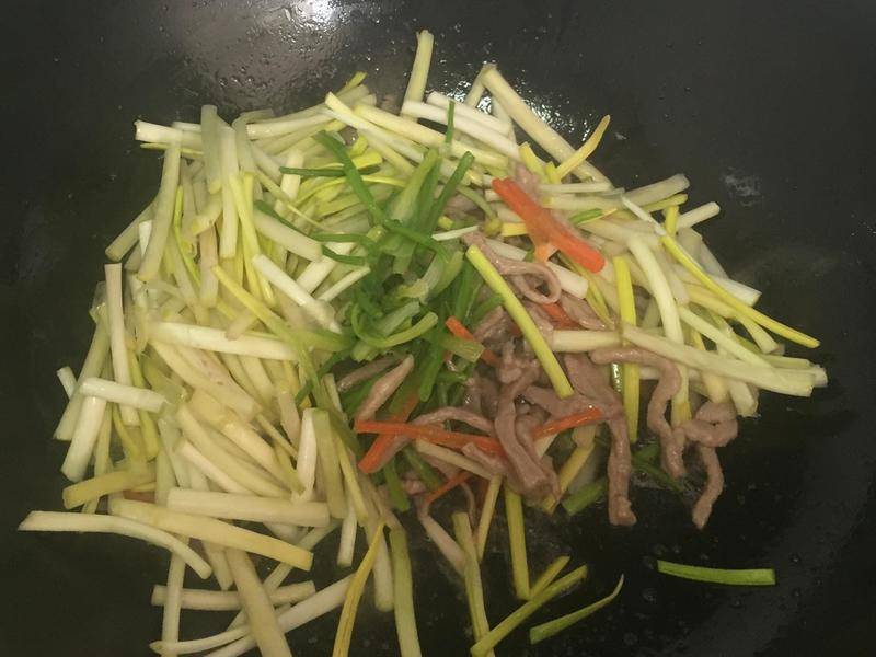 5、放入胡萝卜丝煸炒。