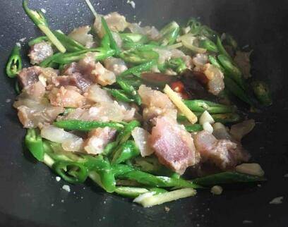 主料:牛蹄筋300克、青椒8个。辅料:大蒜5瓣、生姜20克、八角3个、桂皮1根、香叶3片、香葱2根。