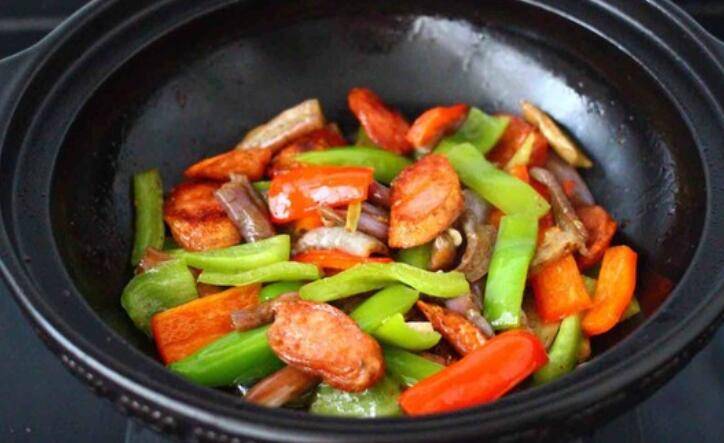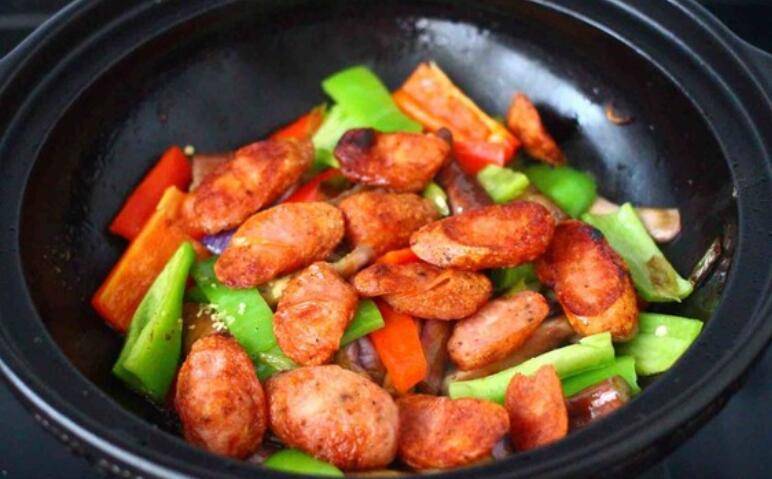 1、砂锅中倒入花生油烧热,把烤肠放入锅中开始小火煎至两面金黄色即可盛出备用。