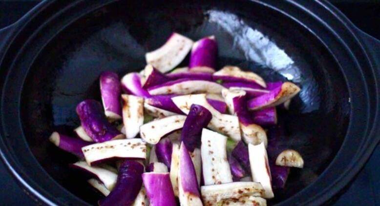 2、大火爆香葱蒜。加入茄条,大火快速翻炒,加入适量的盐调味。