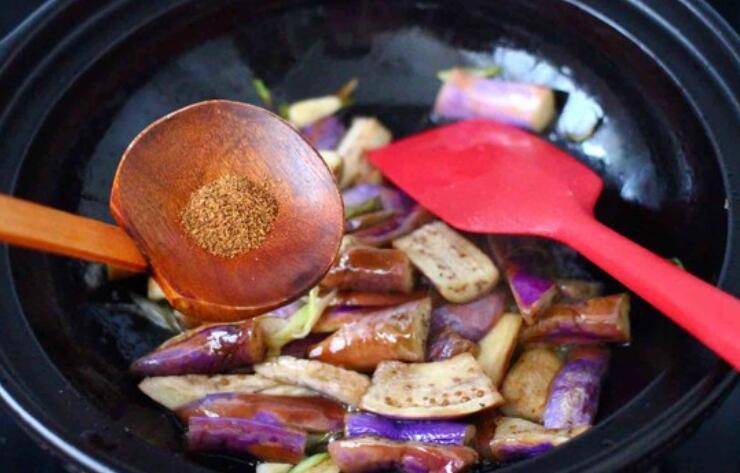 3、加入花椒粉调味,大火继续翻炒至茄条断生变色。