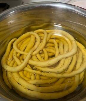 最佳答案准备食材:面粉250克、鸡蛋1个、盐5克、水适量、猪油8克、芝麻5克。鸡蛋,芝麻,面粉,适量水,搅拌。搓成团。直到表面光滑。将面团分成小份,搓成细长条放。油里静止24小时(温度低)。隔天将细长条面团继续拉长、拉细。拿筷子固定两边,放油锅里炸。半斤面粉,炸出来一大盆。