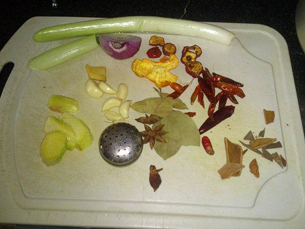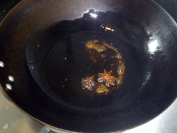 3、热油锅,放入冰糖、大料和老抽。