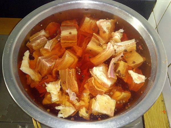 2、牛腰窝洗净切块,用花椒水浸泡后再用热水煮,打去浮沫子。