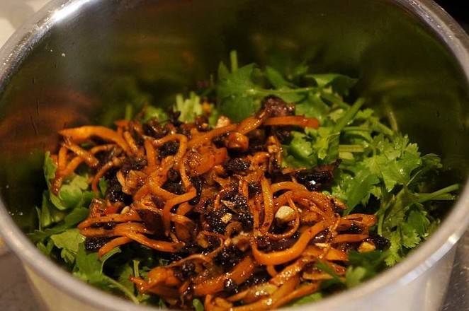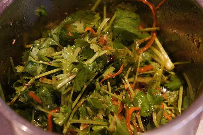 3、香菜切段,胡萝卜切丝,大蒜切碎。