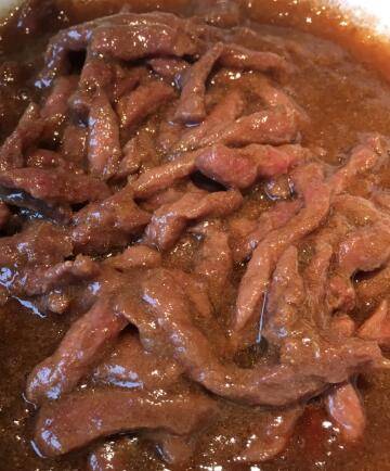 牛肉断纹路切丝,牛肉切丝后加盐加水抓至起粘上劲后,加糖加老抽酱油,腌制15到30分钟。