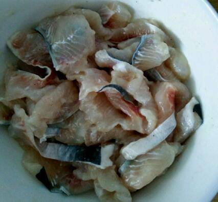 黑鱼切成薄片,用盐、料酒、白胡椒粉、淀粉、油腌制半个小时。