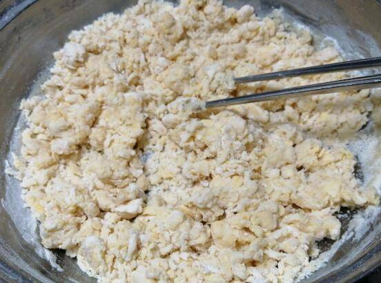 2、加入面粉用筷子搅拌成絮状。