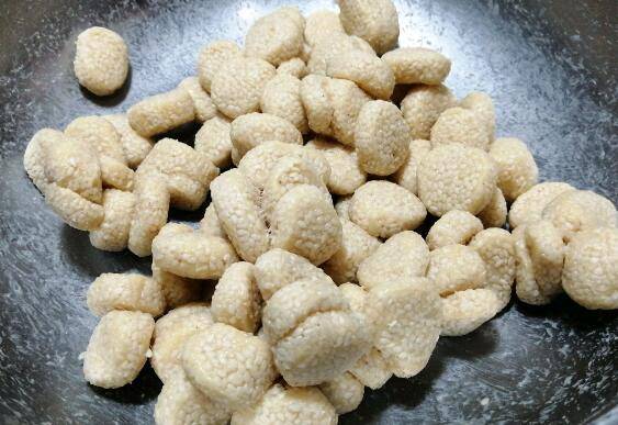 9、油热后放入搓好的芝麻球,大火炸。