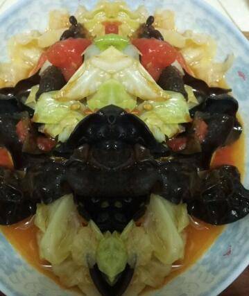 圆白菜半个、木耳一小把、西红柿半个。圆白菜洗净去掉粗筋撕成块,泡发好的木耳洗净备用。西红柿去皮切块过油备用,油热后放入圆白菜和木耳翻炒。炒匀后倒入西红柿,放入酱油、盐翻炒均匀即可。