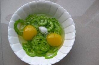 2、倒掉盐水,将苦瓜用清水冲一遍,挤去水分,加入两个鸡蛋、一茶匙盐。