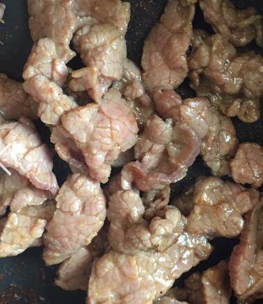 油烧热后下腌制好的牛肉炒至表面发白马上盛出。