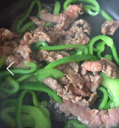 锅里再次烧热油下菜椒翻炒,翻炒后加入牛肉,加入少许味极鲜翻炒均匀即可出锅。