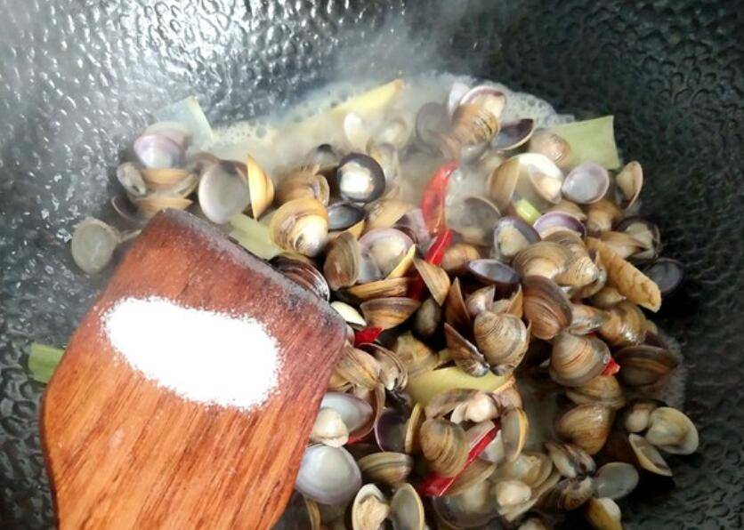 4、炒至沙蚬开口后,放盐调味即可出锅。