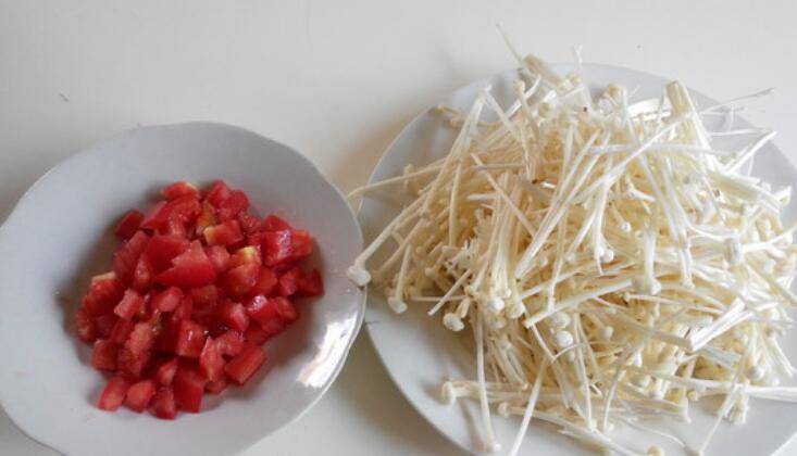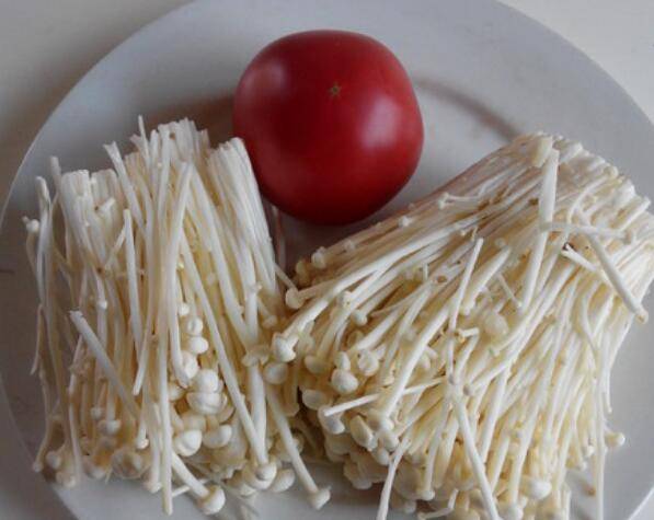 用料:金针菇250克、西红柿1个、植物油2汤匙、大蒜3瓣、食盐3克、小葱1棵。