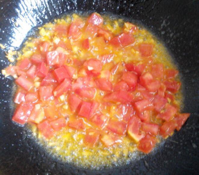 4.下入西红柿丁翻炒1-2分钟。