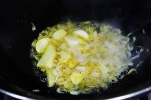 4、锅中热油,倒入姜、蒜和虾米炒香。