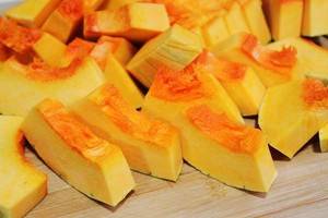 1、南瓜去皮,切厚片。