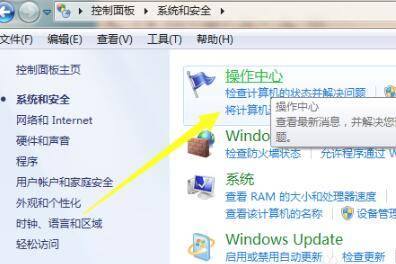 在系统和安全下的设置属性面板右边会显示操作中心,点击就可以进入。