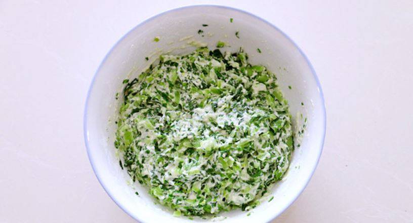 2、小白菜放到一个大碗里加一把面粉,用筷子调成很软的菜面糊,糊要软但不能是流动状态。