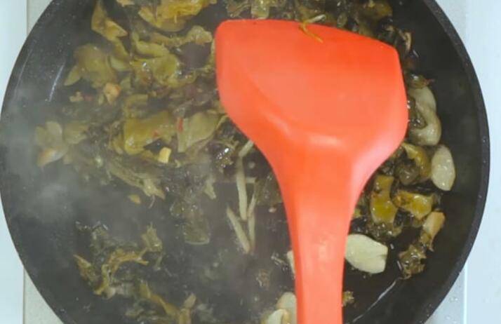 2、起锅烧油,放入姜丝、蒜、酸菜500克,大火翻炒。