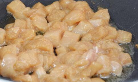 起锅热油,加入腌制好的鸡胸肉翻炒至变色。