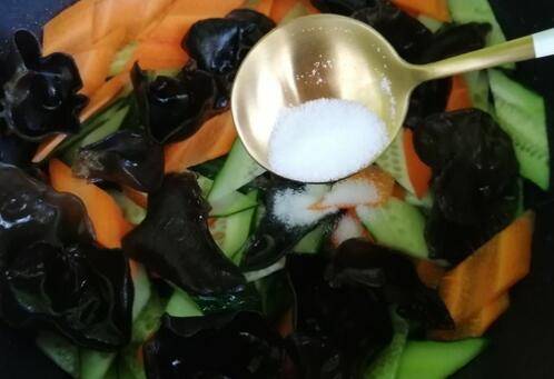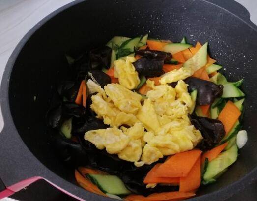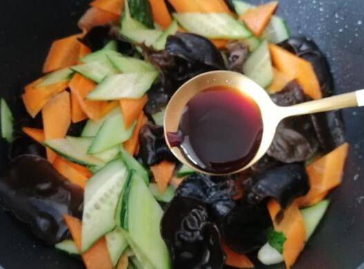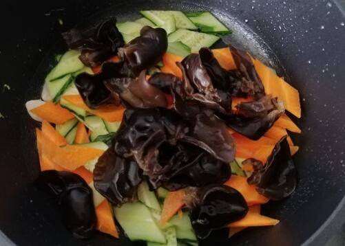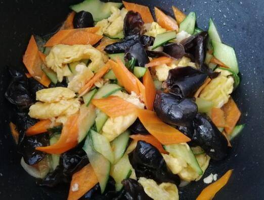 最佳答案用料:木耳80克、黄瓜1根、胡萝卜1根、鸡蛋2个、油适量、盐1勺、大蒜适量、蚝油1勺、淀粉1勺。1、干木耳用凉水先泡发。2、胡萝卜和黄瓜切成菱形块。3、先把鸡蛋炒熟备用。4、锅里再倒入油,放蒜片炝锅,倒入黄瓜片、胡萝卜片和木耳翻炒一下。5、加一勺盐调味。6、倒入一勺蚝油提味。7、把炒好的鸡蛋...