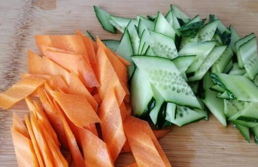 用料:木耳80克、黄瓜1根、胡萝卜1根、鸡蛋2个、油适量、盐1勺、大蒜适量、蚝油1勺、淀粉1勺。