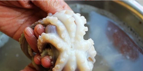 4、把章鱼的黑色的“外衣”顺着从头往下撕下来,这是最腥的部位,一定要清洗干净。