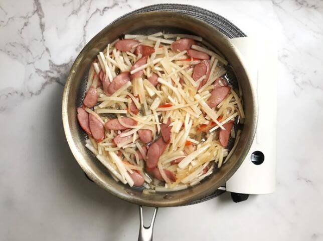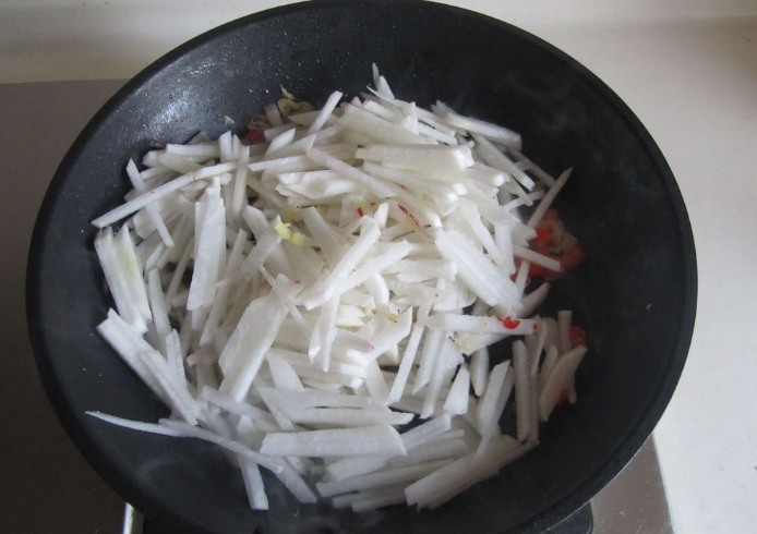 4、翻炒出香味后加入白萝卜丝进去翻炒。