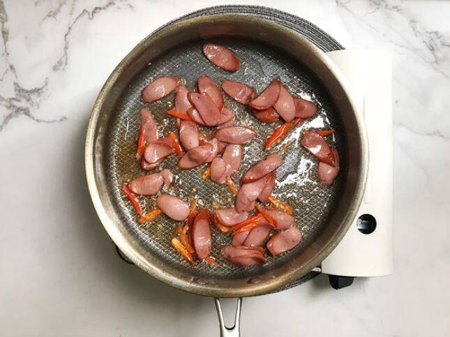 5、牛肉肠倒进锅内,将牛肉肠的水分炒干。
