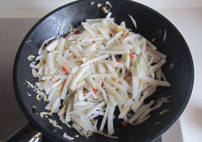 7、再倒入白萝卜丝,翻炒。