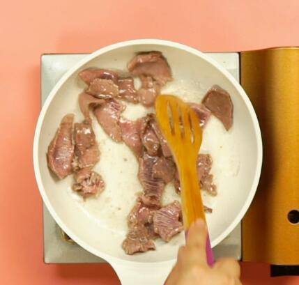 锅中放油,牛肉炒至变色。