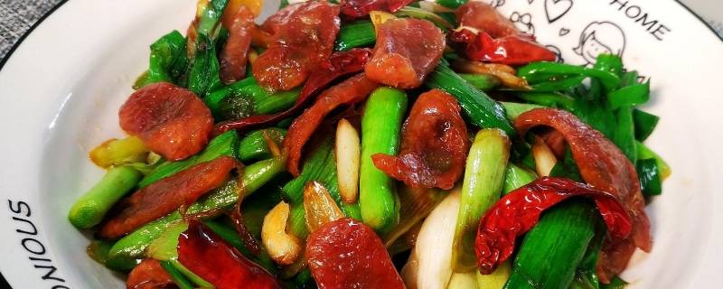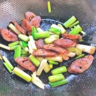 蒜苗68克、腊肠57克、蒜瓣23克、小葱14克、盐8克、生抽9克、老抽5克、蚝油6克。