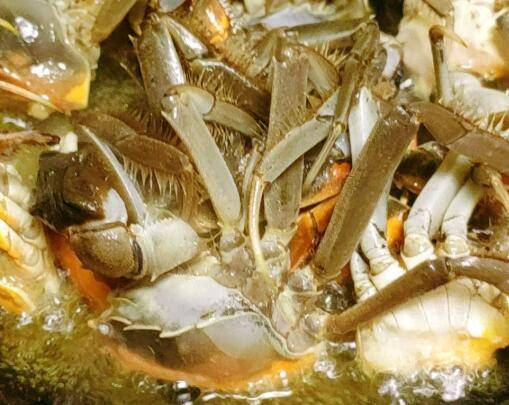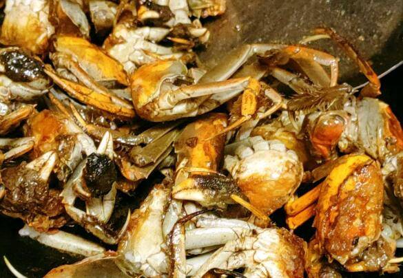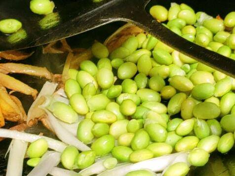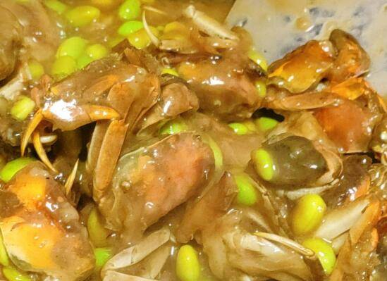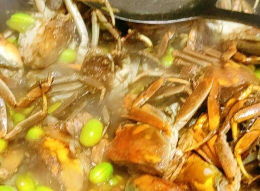 放入毛豆翻炒,倒入河蟹翻炒。