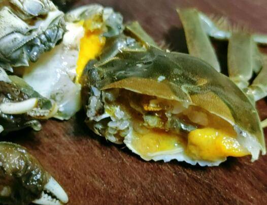 新鲜毛豆剥皮取豆,河蟹对半切开去腮。